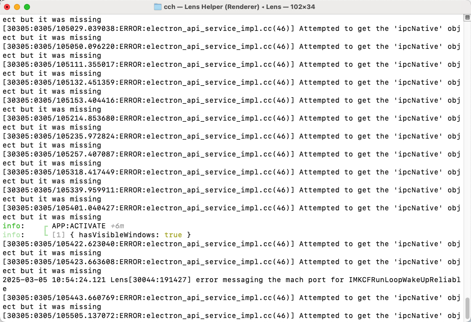 Hi, we would need to see more of the logs to see the actual error. The error in the screenshot about “error messaging the mach port” seems benign (Electron[88193:16856386] error messaging the mach port for IMKCFRunLoopWakeUpReliable · Issue #45002 · electron/electron · GitHub).