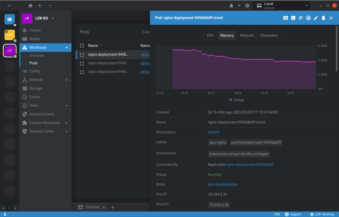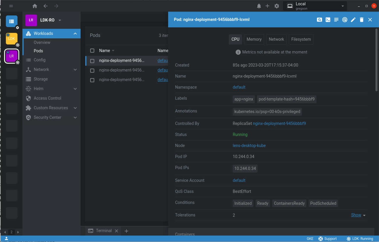 Once it is created in Lens, return to the LDK-RO cluster (which is the developer-reader context). Disconnect and reconnect to ensure that the roles and bindings are picked up, and observe the details page for a pod now includes metrics: