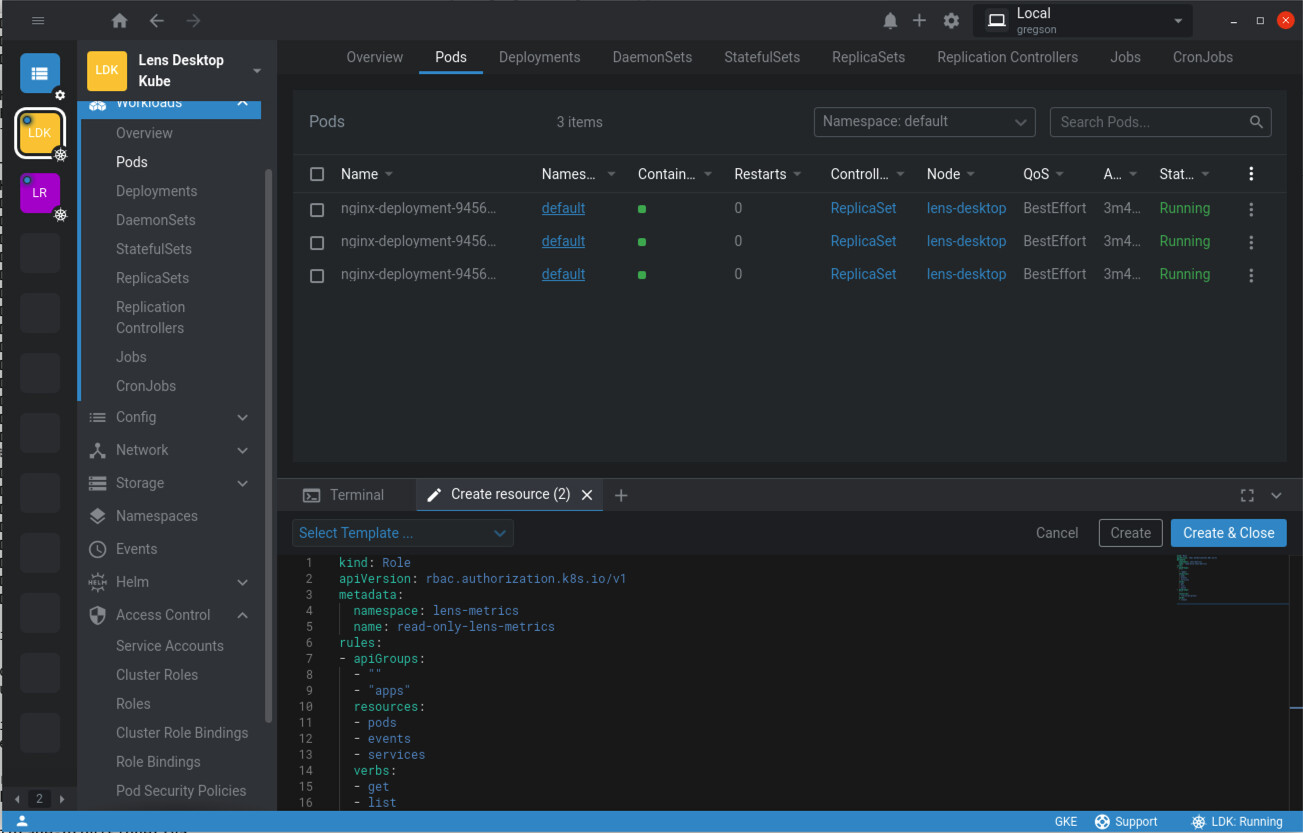 This role applies only to the lens-metrics namespace and doesn’t impact the access that developer-reader has in the rest of the cluster. As before, this Role resource can be created in Lens: