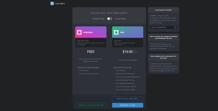 - Lens Pro: These subscriptions are required for professional use in larger businesses. The pricing is $19.90 per user / month or $199 per user / year. You may purchase a Lens Pro subscription here. Note: We are currently offering a Lens Founders’ Promotion for a 50% discount.