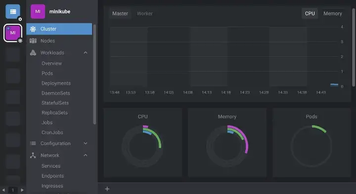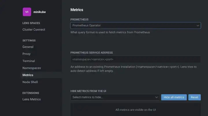 Select Lens Metrics to enable a new instance. If you choose this option, Prometheus will take a minute or two to start. Press ESC to exit the Settings pane. Lens will connect to your Prometheus and cluster metrics will automagically appear on your cluster dashboard.