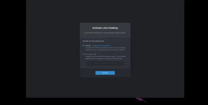 Choose Lens ID if you already have a Lens ID or need to create one. Alternatively, you can select Activation Code to proceed with an air-gapped installation, if you have already set up an activation code.