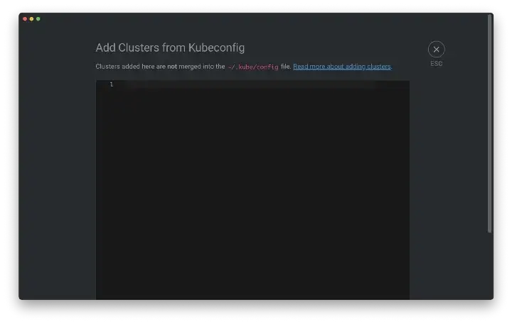 To add a new cluster to the catalog, hover over the blue plus icon in the lower right-hand corner of the screen. You will have the option to add a kubeconfig directly or by syncing with a file.