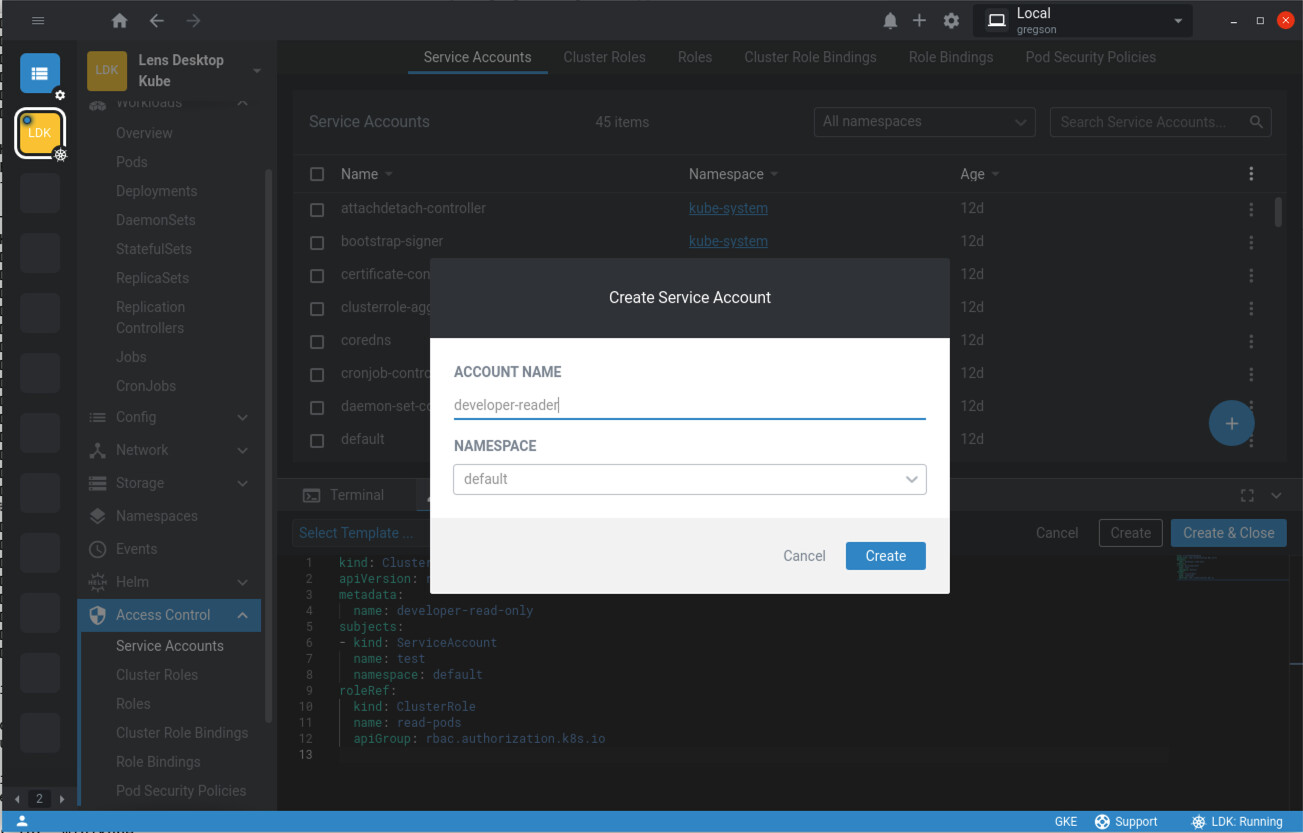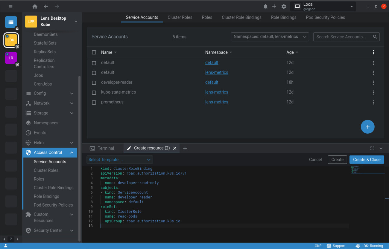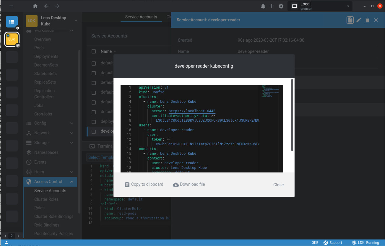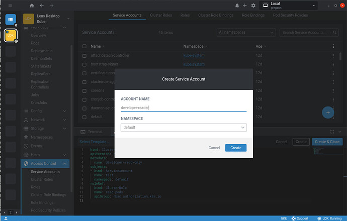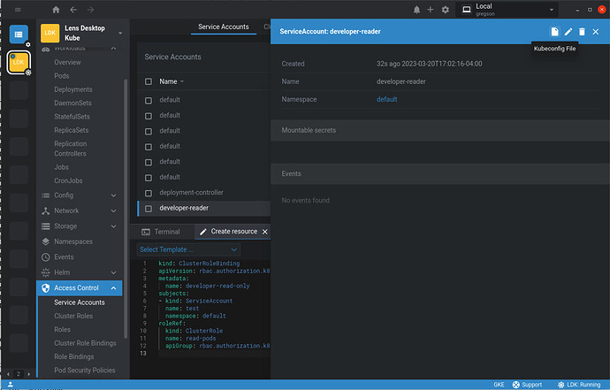 Now we need to create a user that will be bound by this ClusterRoleBinding. We will use a ServiceAccount for this as we can use Lens to create it, as well as the necessary authentication token and the kubeconfig allowing Lens to connect to the LDK cluster with the new RBAC-limited user’s credentials.