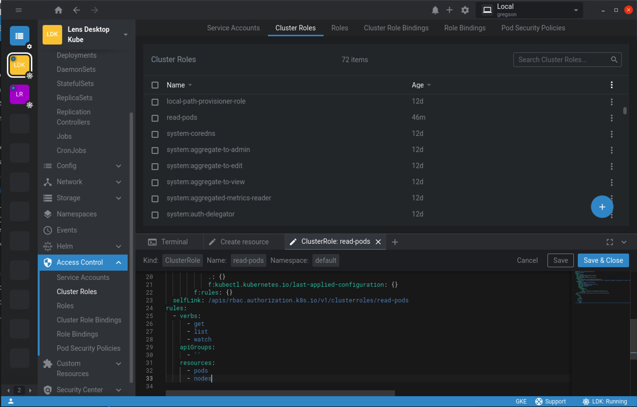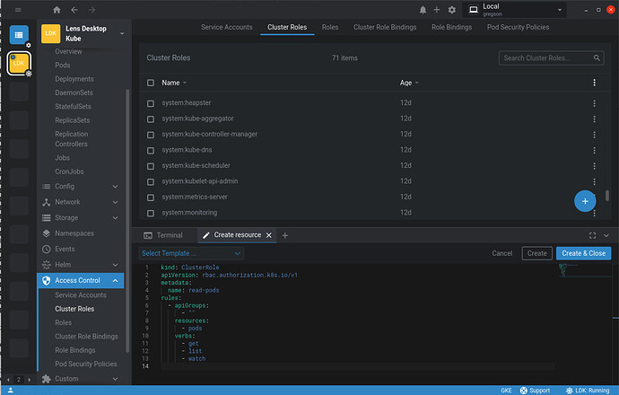You can add this ClusterRole resource directly in Lens (click the + to the right of the tabs in the dock, select ’Create resource’ and copy/paste the above ClusterRole definition, then click ‘Create’ or ‘Create & Close’):