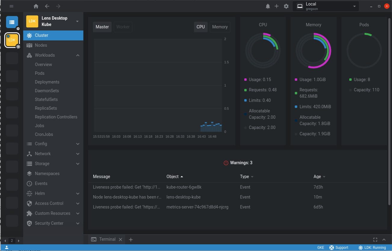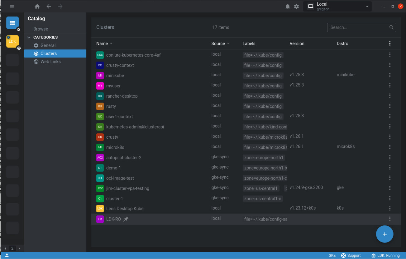 Download the file to your ~/.kube folder, name it config-sa. It’s a good idea to open it with a text editor and change the context name (find the contexts section, line “- name: Lens Desktop Kube”) from Lens Desktop Kube, since that name is already used for the admin access to the LDK cluster. Here, it is renamed LDK-RO. Go to the cluster list in the catalog and the new cluster (LDK-RO context) should be there, assuming Lens is sync’ing with the ~/.kube folder, which it does by default: