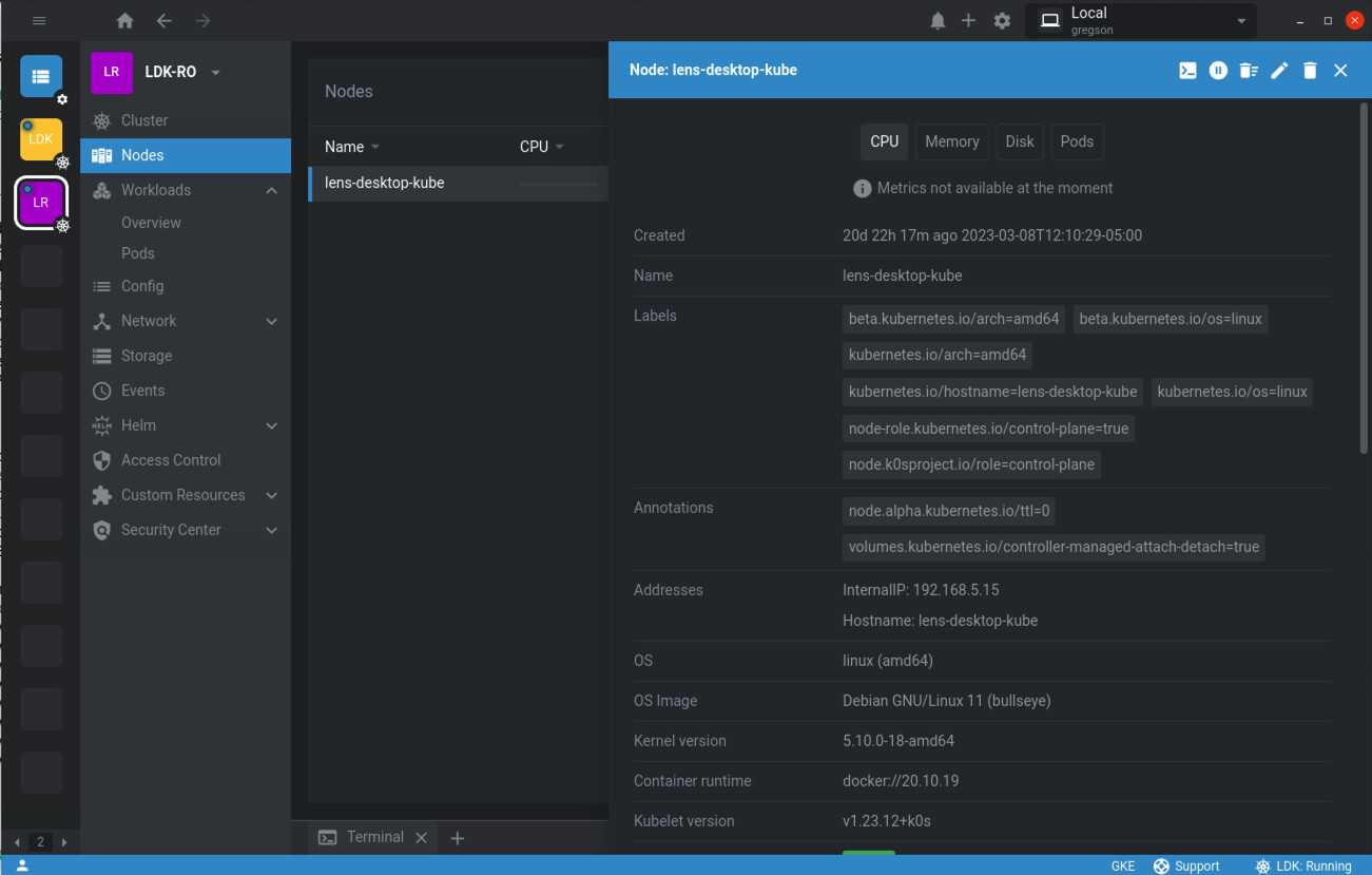 Assuming that the Lens built-in metrics were installed on the LDK cluster, observe that the metrics are not available on the Nodes details page (or anywhere). This is because the user needs more permissions. See the followup post to learn how to enable metrics for an RBAC-limited user.