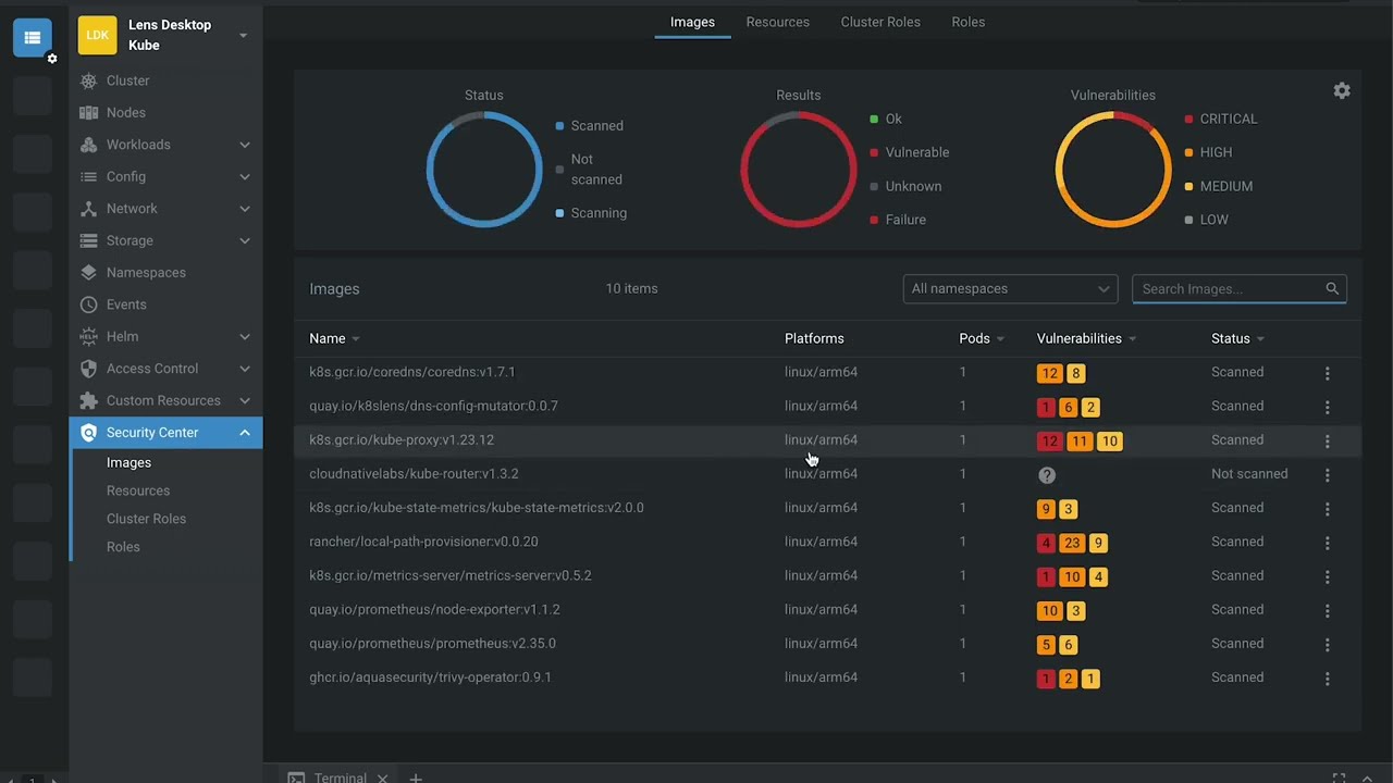 In today’s world, security is of utmost importance for all organizations, and we understand that at Lens. That’s why we’re proud to introduce Lens Security Center, a feature that empowers Lens users to identify vulnerabilities and misconfigurations in their workloads and clusters with ease. The best part? It’s already built-in into Lens Desktop, so there’s no need for additional installations. All you need to do is connect to your cluster and start scanning. Lens Security Center surfaces potential vulnerabilities in images, resources, roles and cluster roles that are immediately relevant and actionable. You can drill down and get more information about any CVEs or misconfigurations that are flagged. You can even set up automatic scanning by deploying an operator to your cluster with a simple toggle switch.