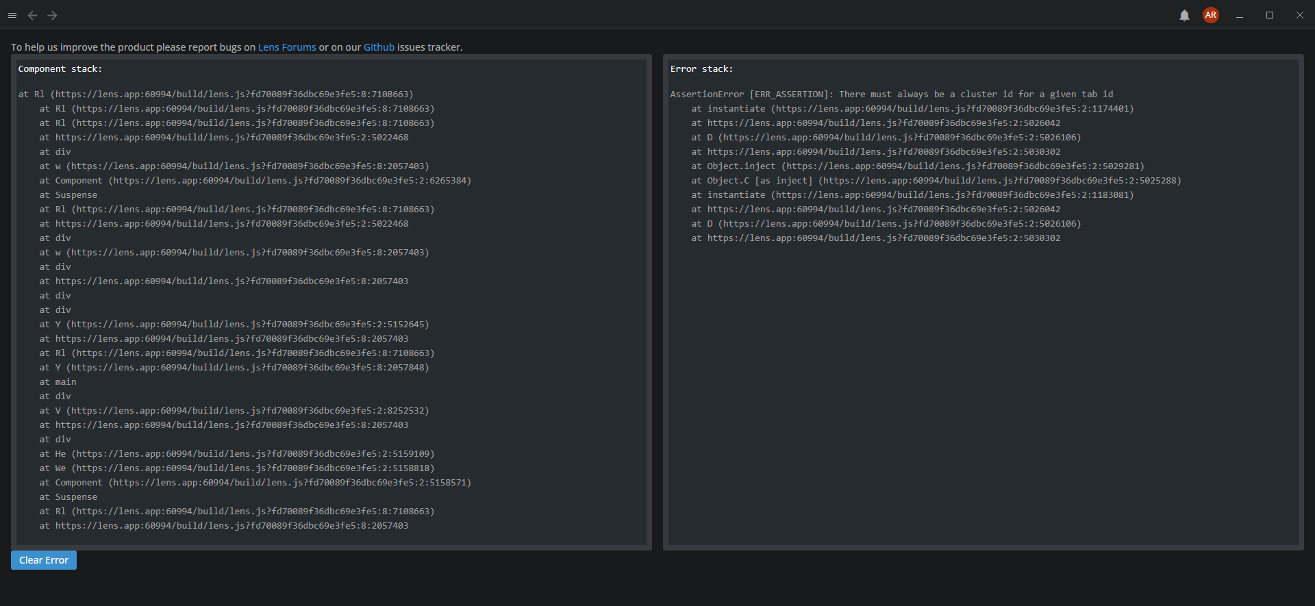 I tried changing some lens setting and the application got stuck then I restarted Lens and post that not able to access even the home page. Please refer uploaded image. None of the options are working now. Tried uninstalling and re-installing it but somehow coming back to same screen.