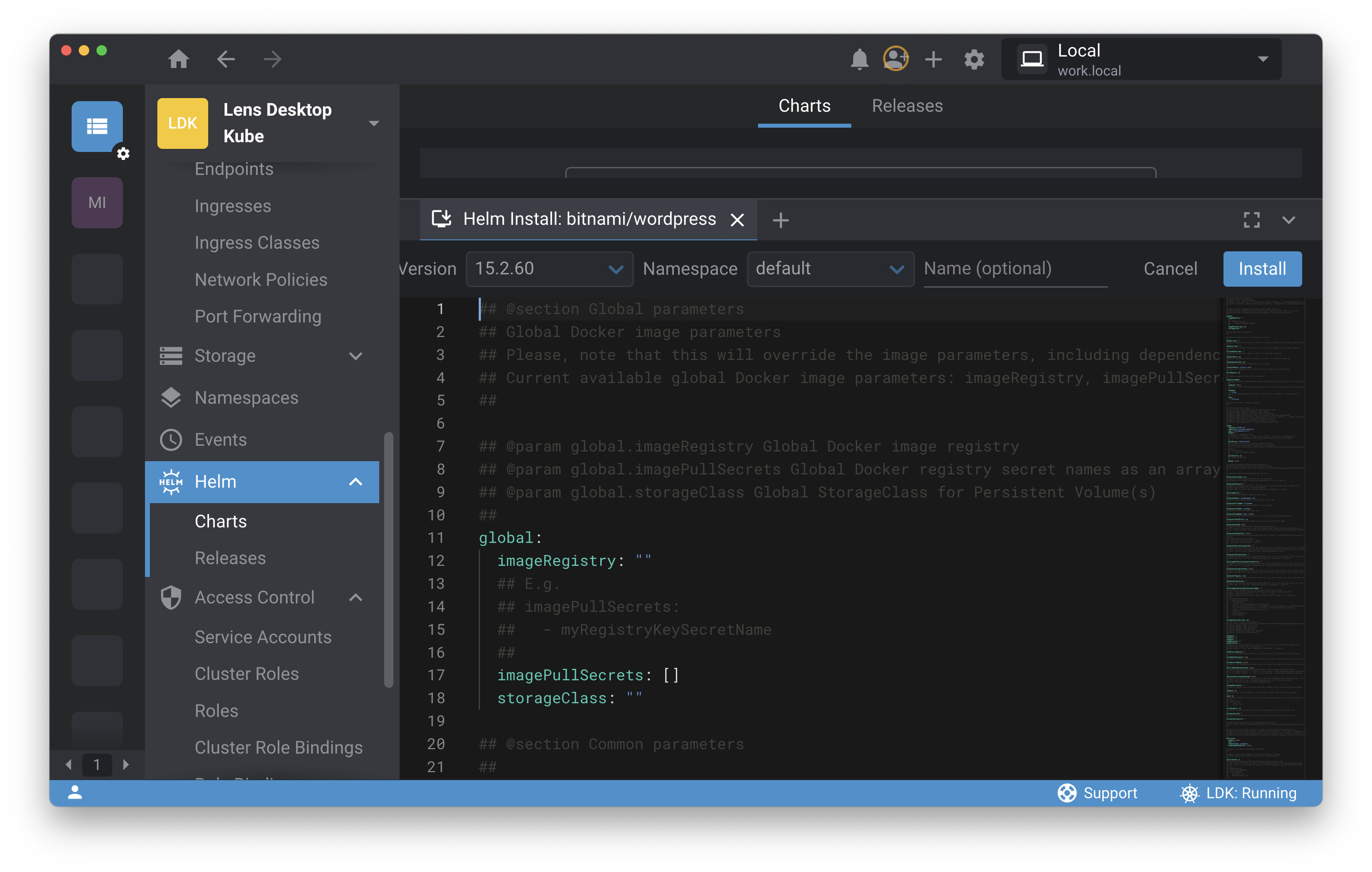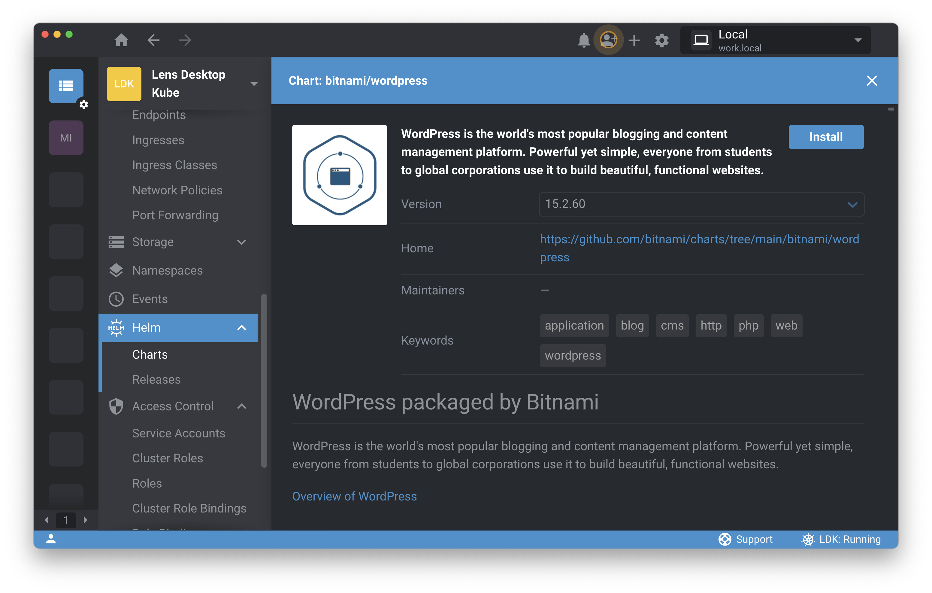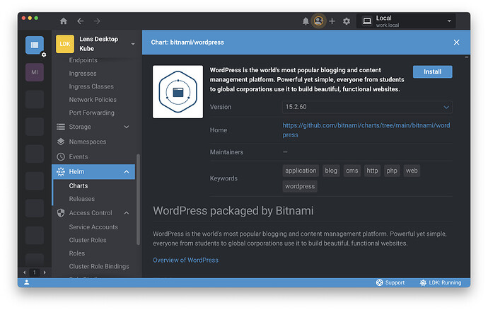 First, you’ll want to add some more workloads to scan. You can use Lens’ Helm integration to quickly deploy a Helm chart for a complex application.