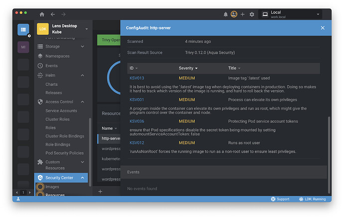 The good news is that Lens Security Center gives you a way to automatically validate your container images and Kubernetes resources against security best practices. If someone on your team has improperly given a resource root privileges or inadvertently exposed sensitive information via environment variables, Lens Security Center can catch the error and help you address it. (Again, we’ll see how to do this below.)