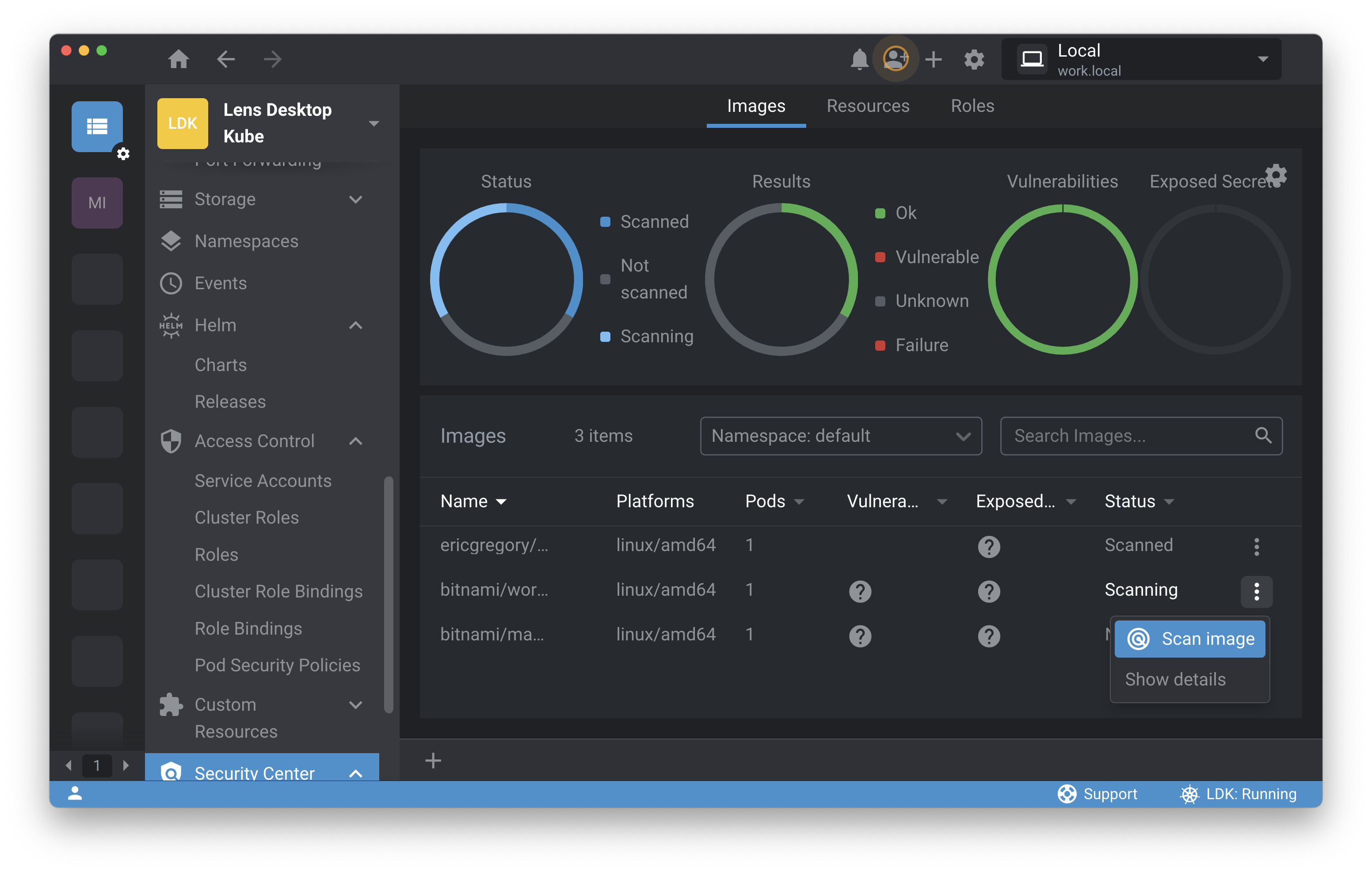 Once the pods are running, scroll down to the bottom of the left-hand menu and click on Security Center . This will give you the choice of scanning Images , Resources , and Roles .
