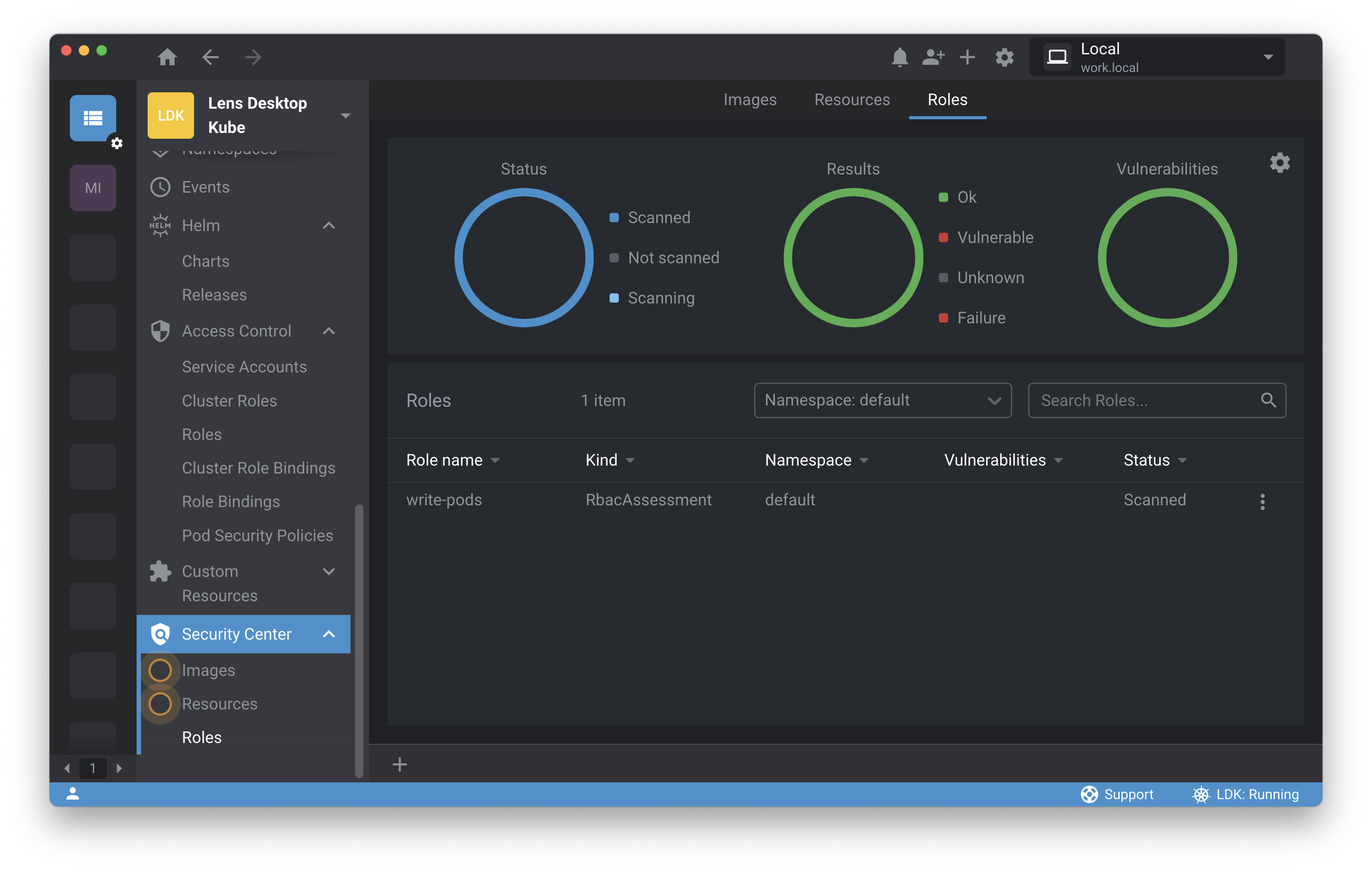 When we talked about Teamwork, we discussed the Role and ClusterRole resources and how they govern RBAC on a Kubernetes cluster. That’s obviously an important dimension of Kubernetes security, so Lens Security Center enables you to scan those resources for conformance to your organization’s particular requirements, assess different roles’ access to sensitive secrets, or verify a given role’s verb permissions on a given resource. Lens Security Center gives you the tools to validate security in a shared Kubernetes environment.