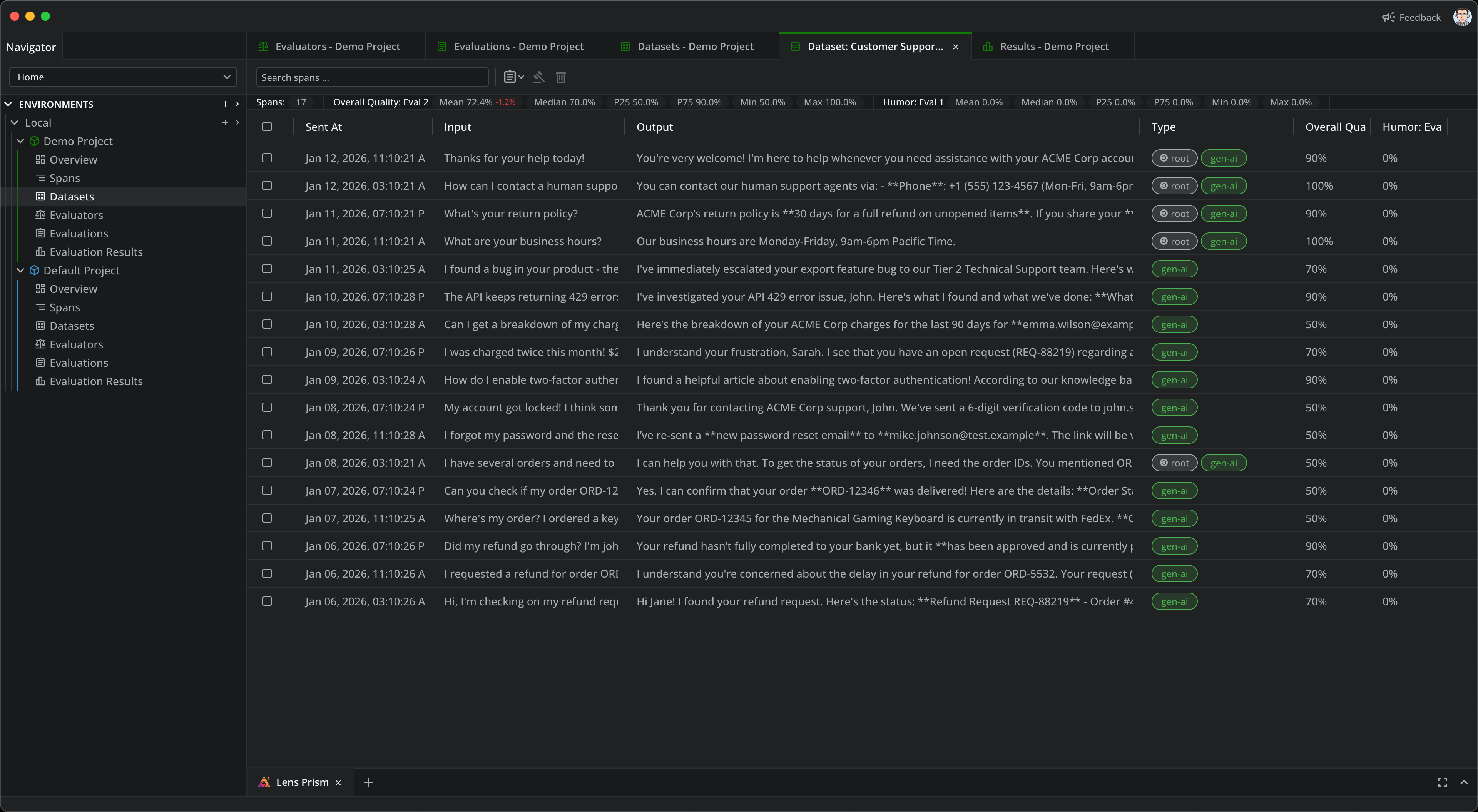 - Datasets — Create and manage datasets of LLM spans with full CRUD operations, version history, and multi-row selection. Use datasets to organize spans for evaluation and comparison workflows.