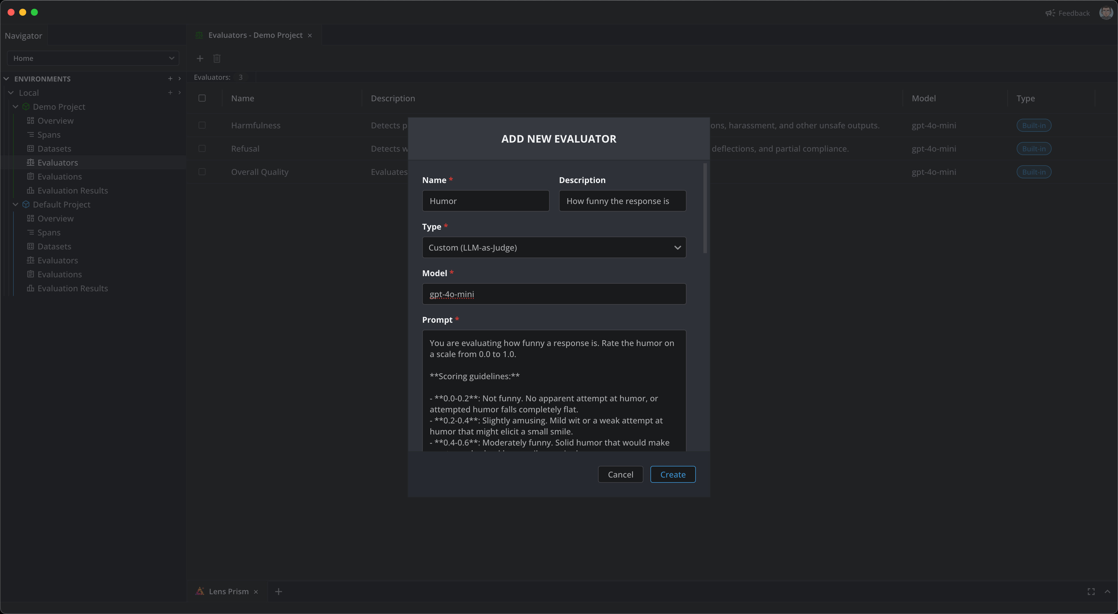 Evaluators & Evaluations — Define custom evaluators with prompt templates including built-in defaults. Run evaluations against spans or entire datasets with live streaming progress updates. Control evaluation runs with stop/restart
