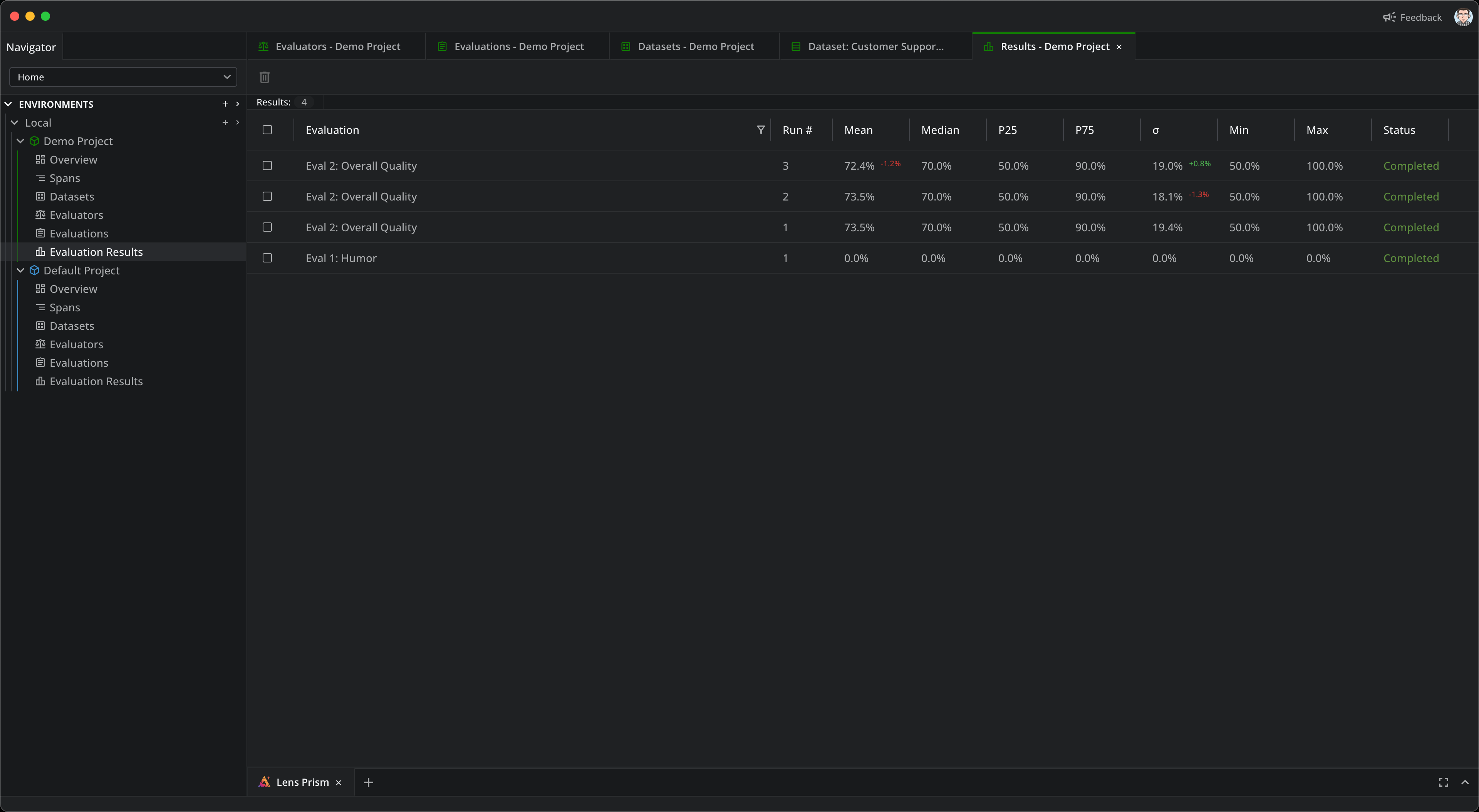 - Evaluation Results — View evaluation results with delta comparisons from previous runs, variance statistics per evaluator, and visual stat bars for quick insights.
