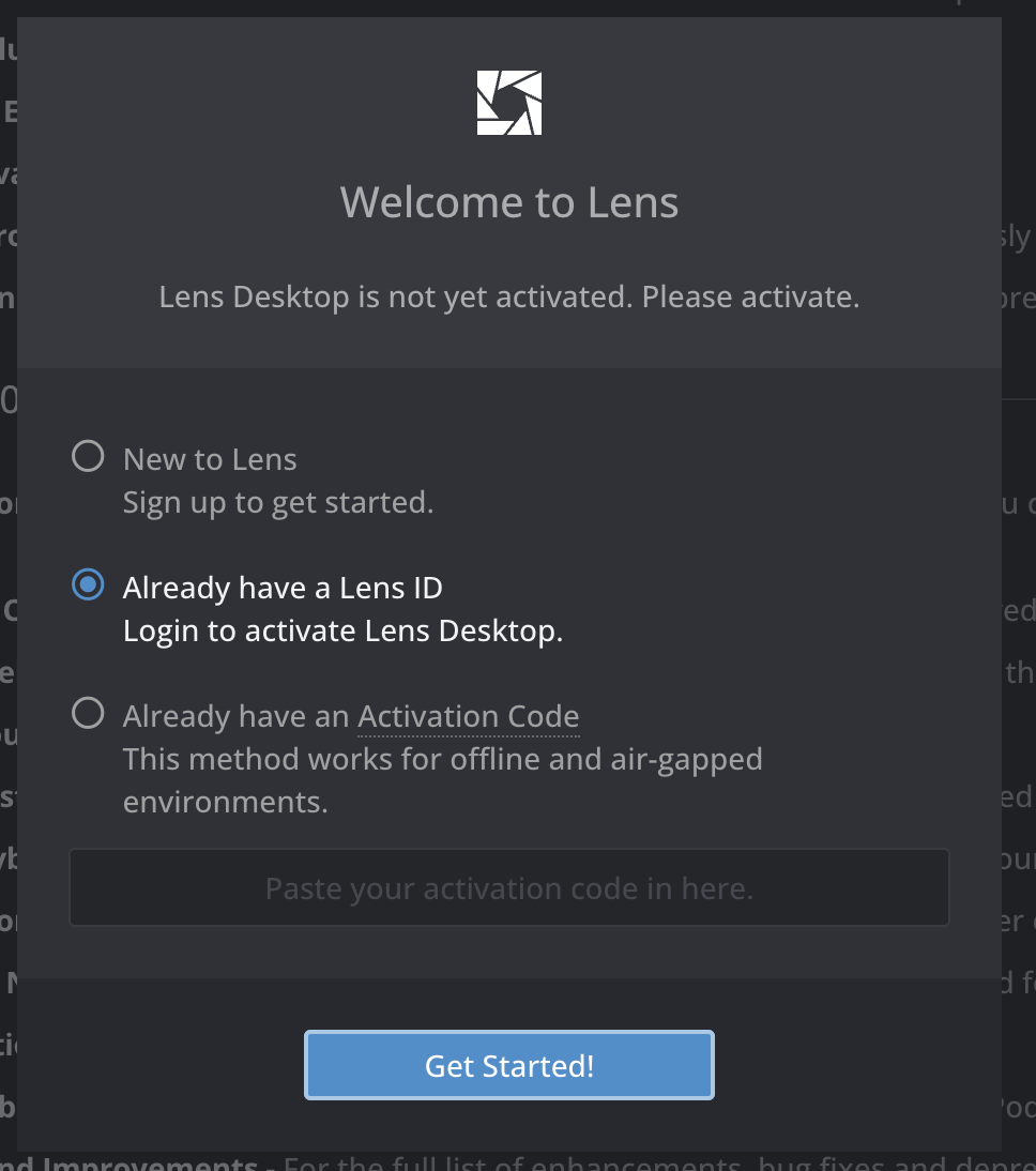 - Start the Lens Desktop app again and click “I already have a Lens ID”